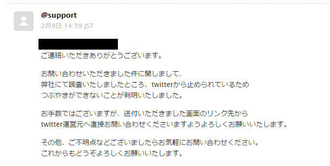 時間を置いて数日後、また同じ様な内容を2回程送るとやっとTwitter本社から返答が来ました。1度で来なかった人はもう1度送った方がいいのかも知れません。