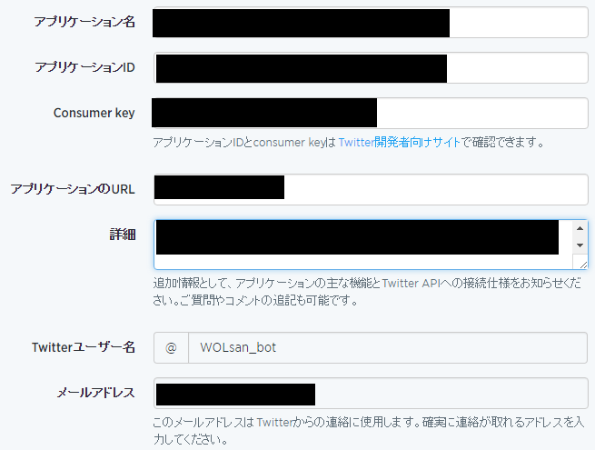 例:リンク先のURLが https://apps.twitter.com/app/12345678/ と表示されているのならば、12345678がアプリケーションIDです。Consumer KEYはAPI KEY とも書かれている場合があります。