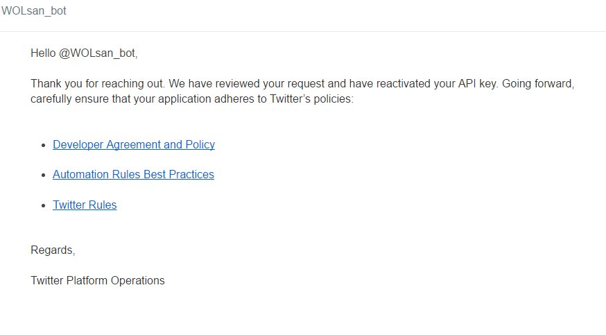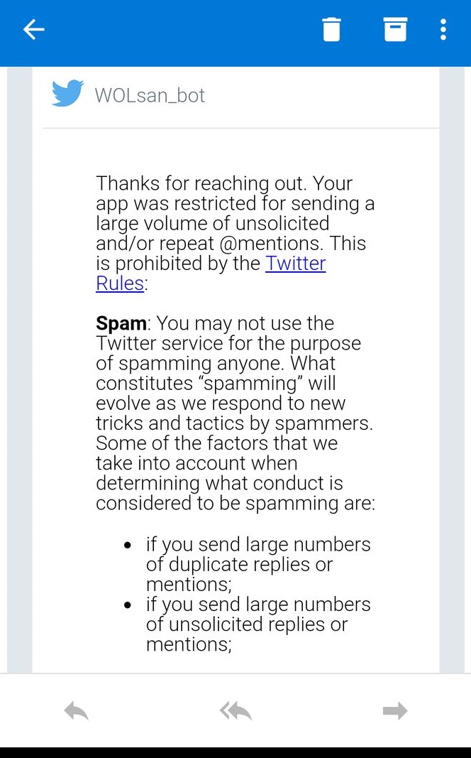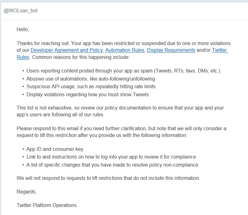 使用しているbot (@WOLsan_bot) は自動呟き&リプライしかせず、自動でのRTや❤やDMもしない、自動フォローやフォロー解除もしない、bot なので同じ発言はする、「は?何がいけなかったんだ?」と困惑しながらもそうでない事とこちらのアカウントの説明&APIを添えて返信を。