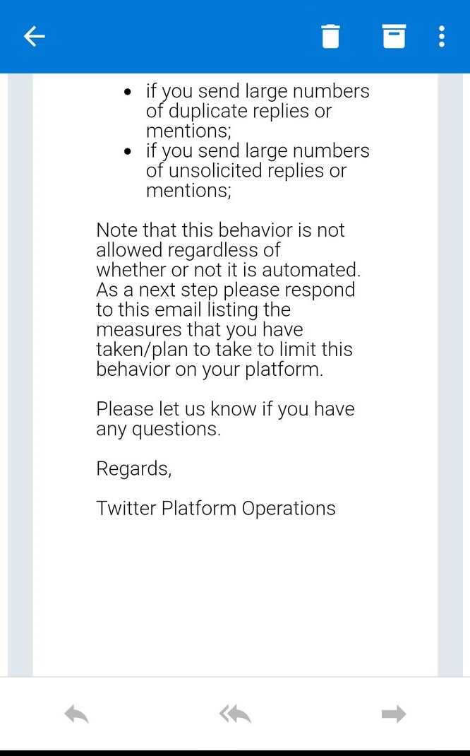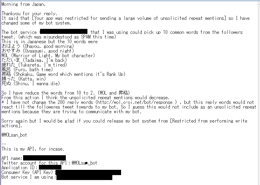 いやこれはキャラクターのbotアカウントですよ?何を言って…ああ、4ヶ月で3万近く自動発言すりゃそりゃスパムと間違えられても仕方がないか…と余り納得いかないものの、向こうの要望の「unsolicited and/ or repeat @metions」「求められていない発言」をTL上反応語句(周りのツイートを拾ってそれに対してリプをする)と解釈をする事に。一応はbotサービスに備えられている機能の一つなので、これを使うなと言われるのもやはり納得は行かないですが…